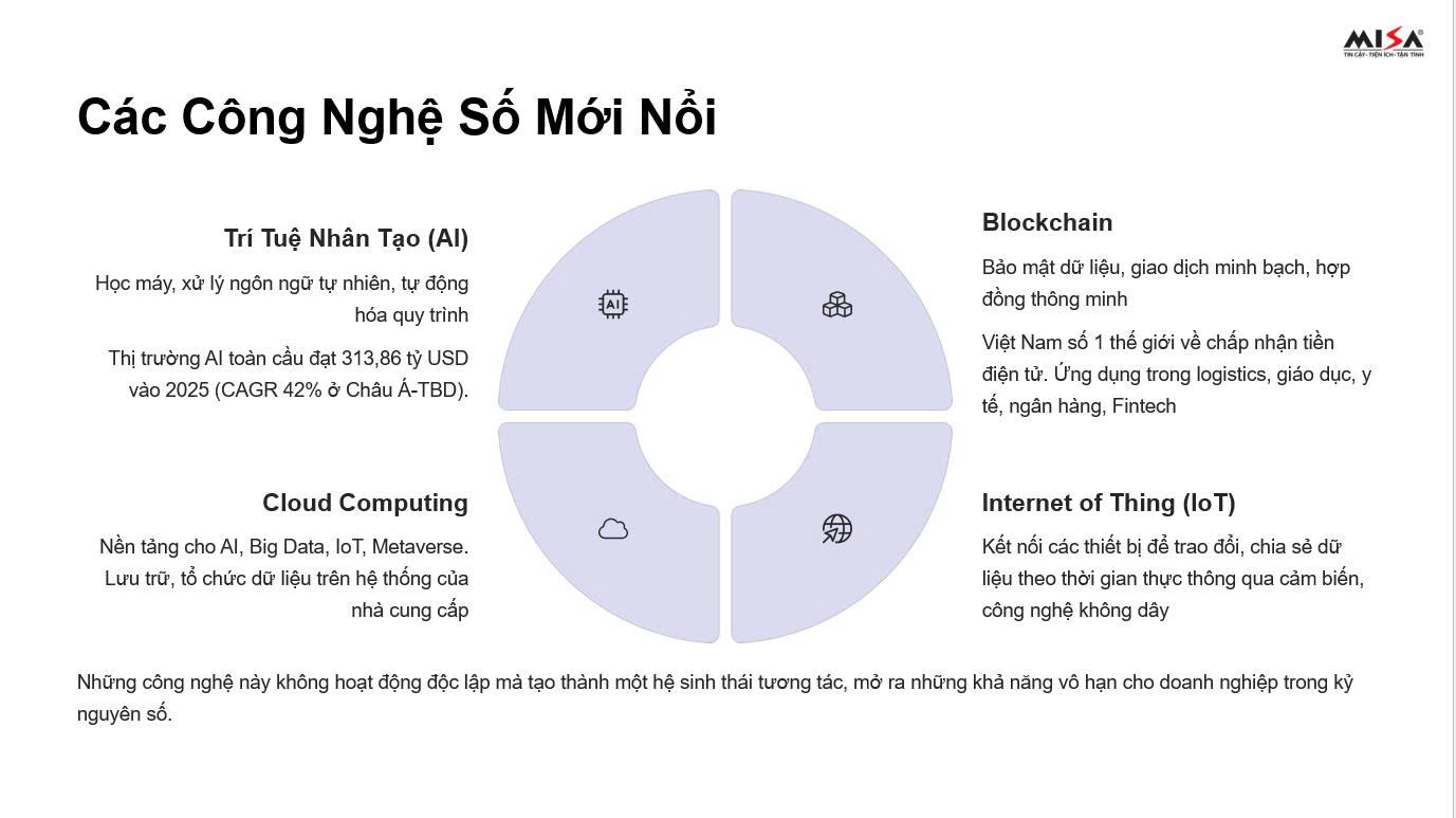 AI giúp doanh nghiệp tối ưu vận hành, tự động hóa quy trình, giảm chi phí và nâng cao trải nghiệm khách hàng. Blockchain mang lại sự minh bạch và an toàn trong giao dịch; IoT tạo nên mạng lưới thông minh hỗ trợ nông nghiệp, logistics, y tế, giáo dục; còn Cloud Computing chính là nền tảng cho tất cả – giúp doanh nghiệp linh hoạt và mở rộng quy mô nhanh chóng.
