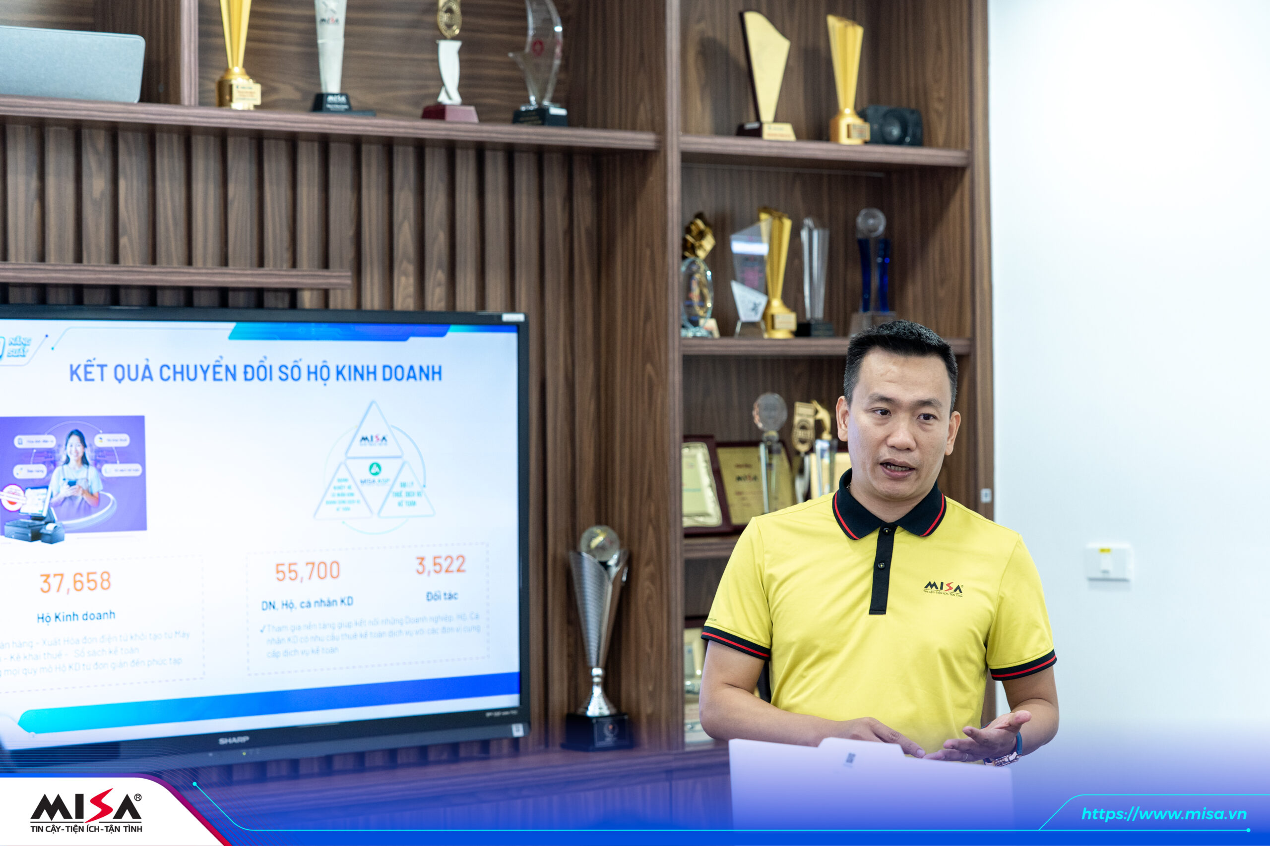 Trong khuôn khổ chương trình, đại diện MISA – ông Nguyễn Phi Nghị, Giám đốc Khối Doanh nghiệp đã giới thiệu hệ sinh thái sản phẩm công nghệ số của MISA với những số liệu ấn tượng về số lượng khách hàng, tốc độ tăng trưởng. Đặc biệt, qua chia sẻ, MISA thể hiện rõ nét năng lực tiên phong cùng trách nhiệm đồng hành cùng hộ kinh doanh, doanh nghiệp theo Nghị quyết 68-NQ/TW.