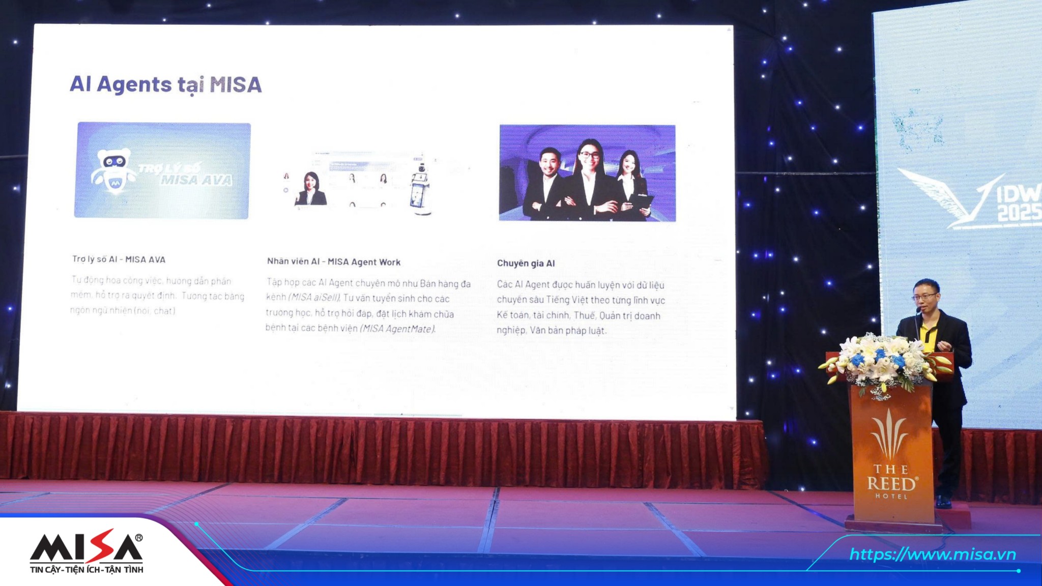 Tại sự kiện, MISA đã để lại dấu ấn đậm nét với những chia sẻ truyền cảm hứng và hoạt động nổi bật. Phó Chủ tịch HĐQT MISA Nguyễn Xuân Hoàng trình bày chủ đề “MISA – Tái định hình sản phẩm theo hướng AI First”, chia sẻ cách MISA tận dụng sức mạnh trí tuệ nhân tạo để đổi mới các nền tảng quản trị, hướng đến phục vụ tối ưu cho doanh nghiệp, tổ chức và cá nhân.