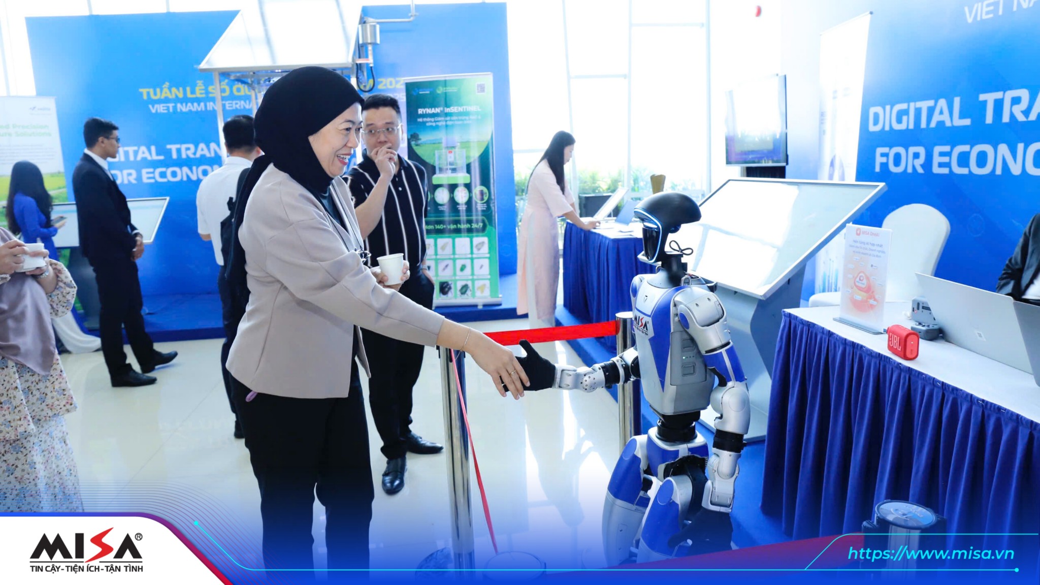 Đặc biệt, sự xuất hiện của Robot MISA tại không gian triển lãm đã thu hút sự quan tâm của đông đảo bạn bè quốc tế và khách tham dự. Robot không chỉ là biểu tượng cho năng lực công nghệ và tinh thần đổi mới của MISA, mà còn mang đến hình ảnh sinh động về việc ứng dụng AI vào cuộc sống và công việc, góp phần lan tỏa thông điệp “AI First – Người dùng trước hết”.