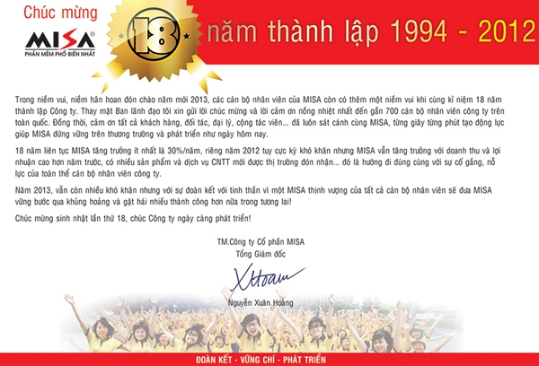 Tin tức lưu trữ MISA mừng 18 năm thành lập công ty (25/12/1994 – 25/12/2012) 25/12/2012 FacebookLinkedin