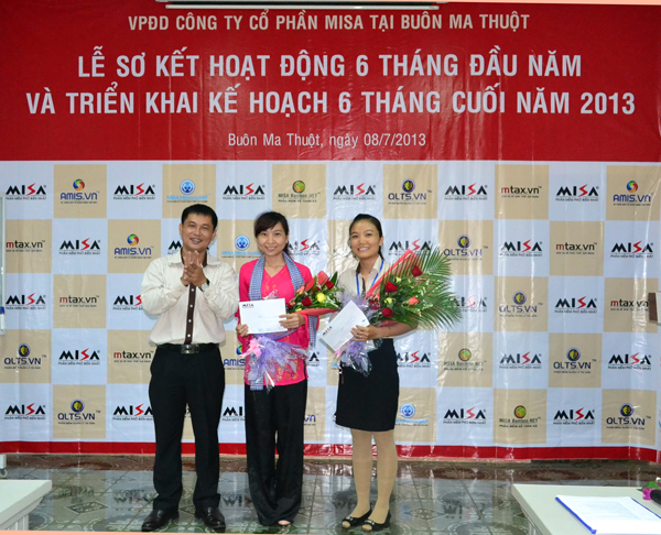 Ông Vũ Trí Thức – GĐVP trao giải nhân viên xuất sắc 6 tháng cho chị Đỗ Thị Thư – Nhân viên triển khai, Phòng KD HCSN & chị Nguyễn Thị Thu Hiền – Nhân viên kế toán, Phòng HCTH