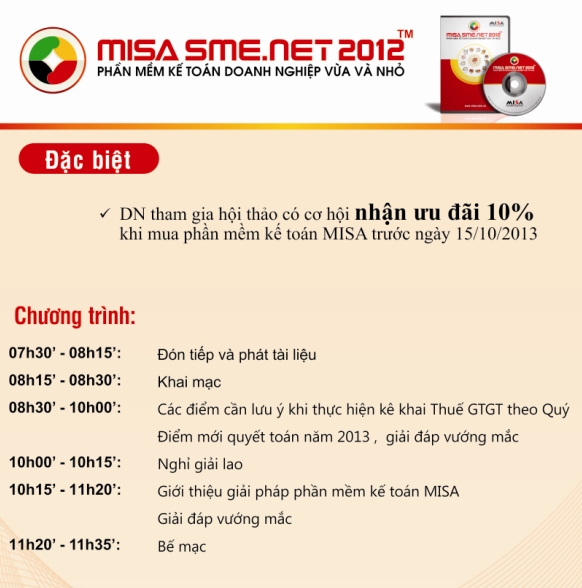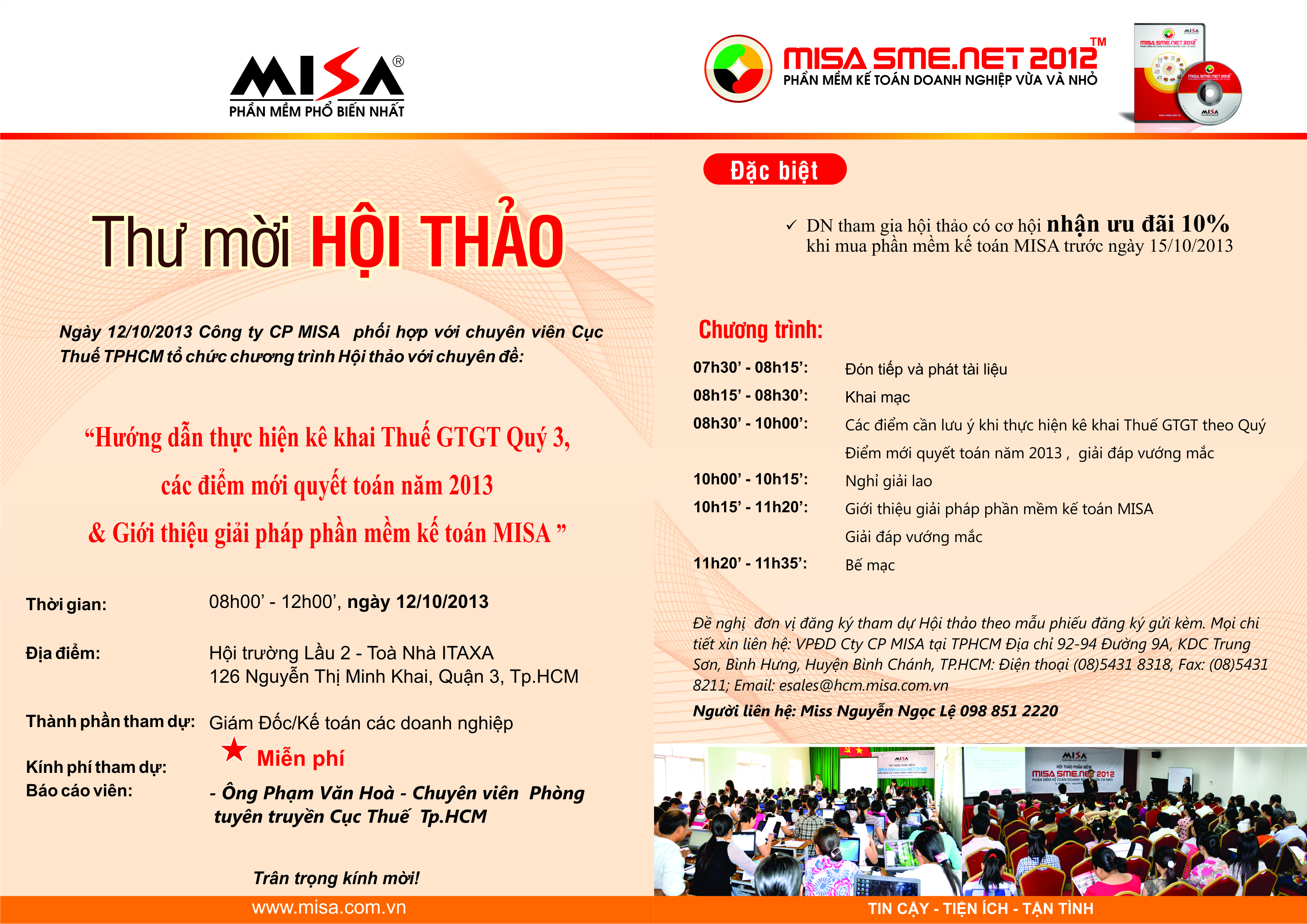 Ngày 12/10/2013, Công ty Cổ phần MISA sẽ phối hợp với Chuyên viên Cục thuế Tp. HCM tổ chức hội thảo với chủ đề “Hướng dẫn kê khai thuế GTGT quý 3, các điểm mới quyết toán năm 2013 và giới thiệu phần mềm kế toán MISA” tại Tp.HCM.