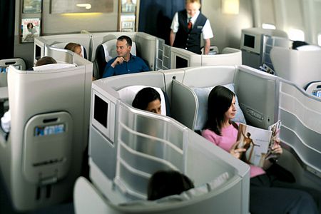 Lên máy bay, khách có vé thương gia không phải xếp hàng mà đi lên cửa riêng, chỗ ngồi luôn được bố trí trong một khoang riêng biệt và được phục vụ các bữa ăn cao cấp từ Âu đến Á.