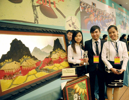 “Đây là bức tranh về phố cổ Hà Nội với chất liệu xơ dừa, bèo tây và mùn cưa; đây là tranh phong cảnh miền núi mang vẻ đẹp hoang sơ được làm từ rơm, cỏ khô và cành cây khô; còn bức tranh con công này trông nó lộng lẫy thế nhưng được làm từ mùn cưa…”, Quân say sưa giới thiệu về những đứa con tinh thần của mình.