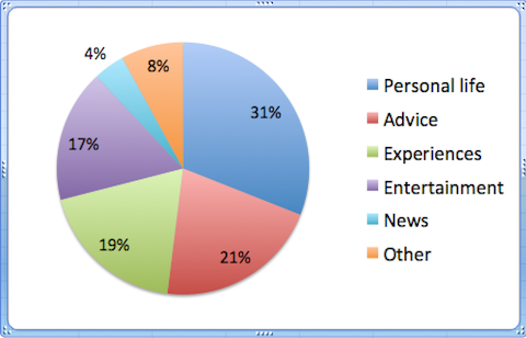 Khi chúng tôi phân tích 682 status được update, chúng tôi nhận ra rằng những status chứa những lời khuyên và dạy bạn những thứ mới được chia sẻ nhiều hơn 522% những status không phải lời khuyên. Một lần nữa nó quan trọng vì chia sẻ trong Facebook có giá trị nhiều hơn like trong thước đo Edgerank.