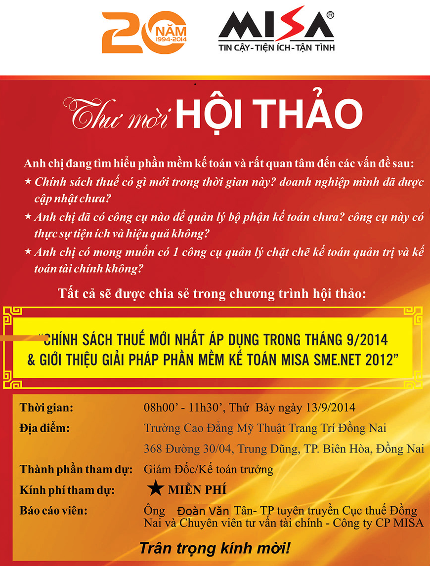 Miễn phí tham dự hội thảo phần mềm kế toán MISA tại Đồng Nai, 13/9
