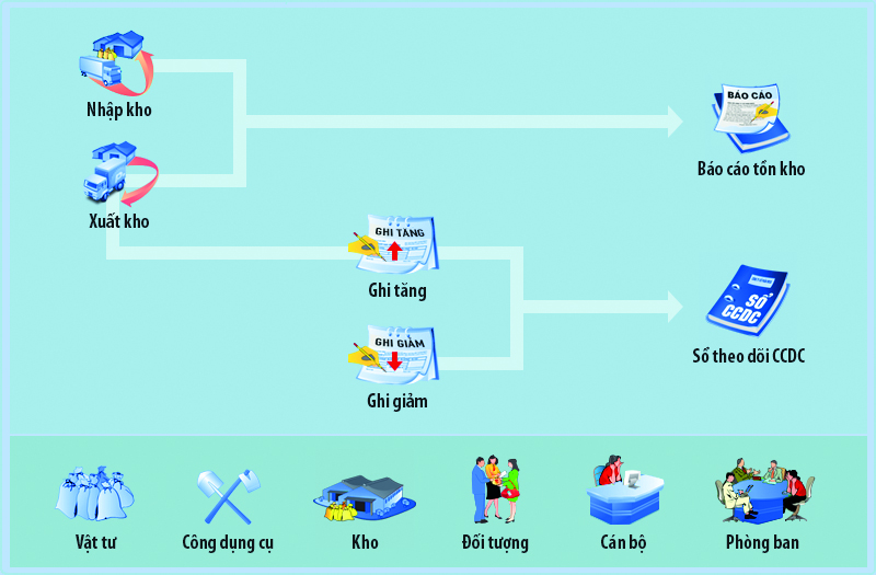 - Hỗ trợ việc quản lý, theo dõi số lượng, giá trị nhập xuất tồn của vật tư, công cụ dụng cụ, đồng thời cho phép kiểm soát số lượng, giá trị nhập xuất tồn của vật tư, công cụ dụng cụ, đồng thời cho phép kểm soát số lượng cộng cụ dụng cụ được sử dụng theo từng phòng ban.