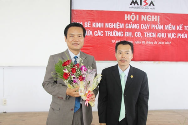 Ông Lữ Hồng Chương – P.TGĐ công ty (vest đen) đã tặng hoa tuyên dương những đơn vị đã đạt thành tích tốt trong việc giảng dạy môn kế toán máy MISA