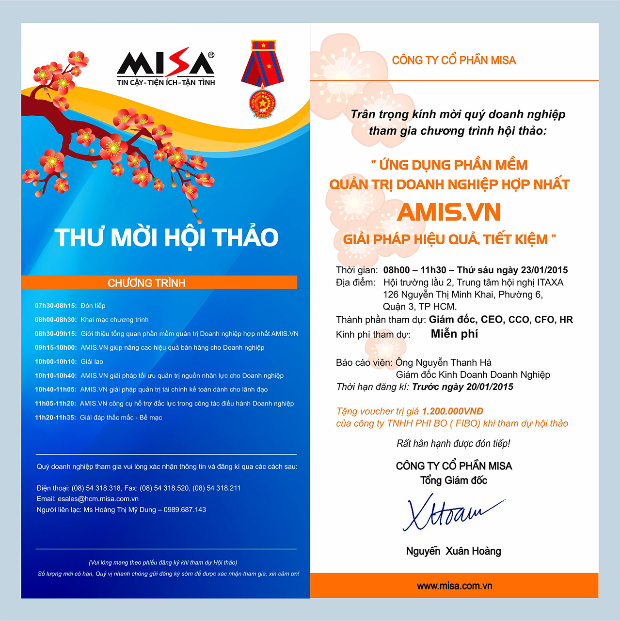 Với mục tiêu hỗ trợ các doanh nghiệp ứng dụng tốt công nghệ thông tin vào phục vụ cho công tác quản lý để nâng cao hiệu quả hoạt động sản xuất kinh doanh. Vào ngày 23/01 Công ty Cổ phần MISA sẽ tổ chức hội thảo “ỨNG DỤNG PHẦN MỀM QUẢN TRỊ DOANH NGHIỆP HỢP NHẤT AMIS.VN-GIẢI PHÁP HIỆU QUẢ, TIẾT KIỆM” tại Hồ Chí Minh.