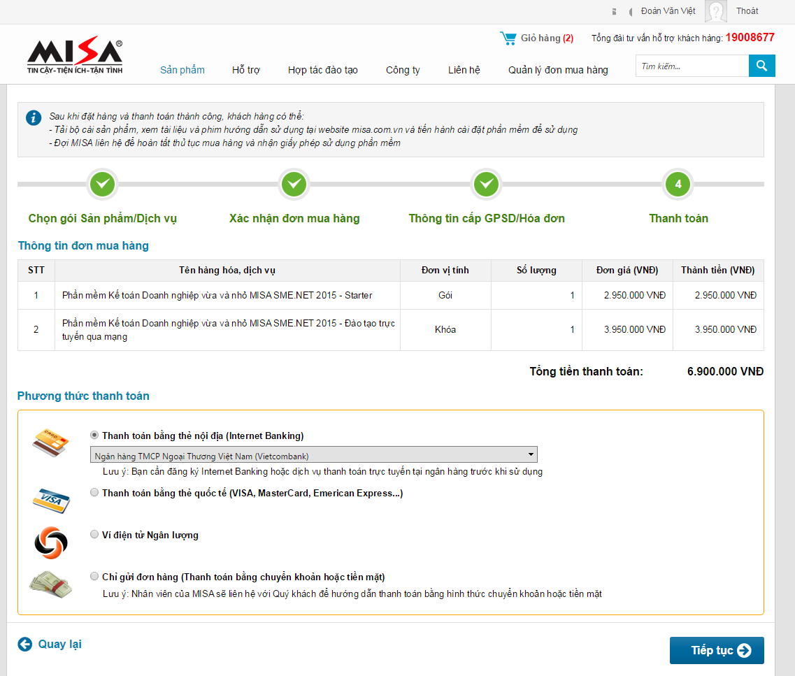 Lưu ý: Nếu khách hàng không thực hiện việc thanh toán trực tuyến mà thực hiện việc thanh toán bằng cách ra ngân hàng để chuyển khoản hoặc trả bằng tiền mặt thì khách hàng chọn vào “Chỉ gửi đơn hàng”, khi đó NVKD của MISA sẽ liên hệ với KH để hướng dẫn KH thực hiện thủ tục thanh toán và bàn giao sản phẩm.