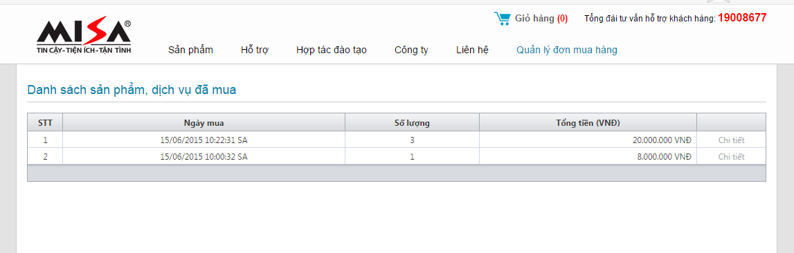 Khi bấm vào quản lý đơn mua hàng sẽ hiển thị danh sách lịch sử các lần mua hàng từ website MISA: