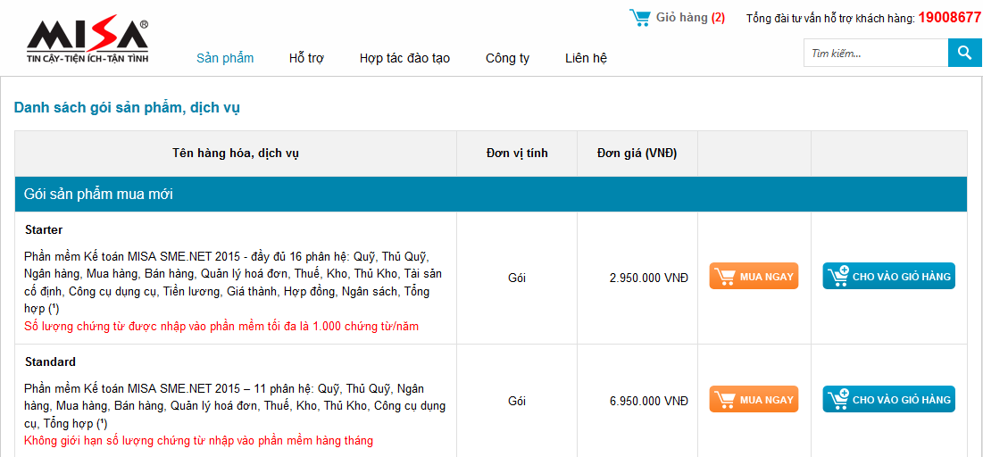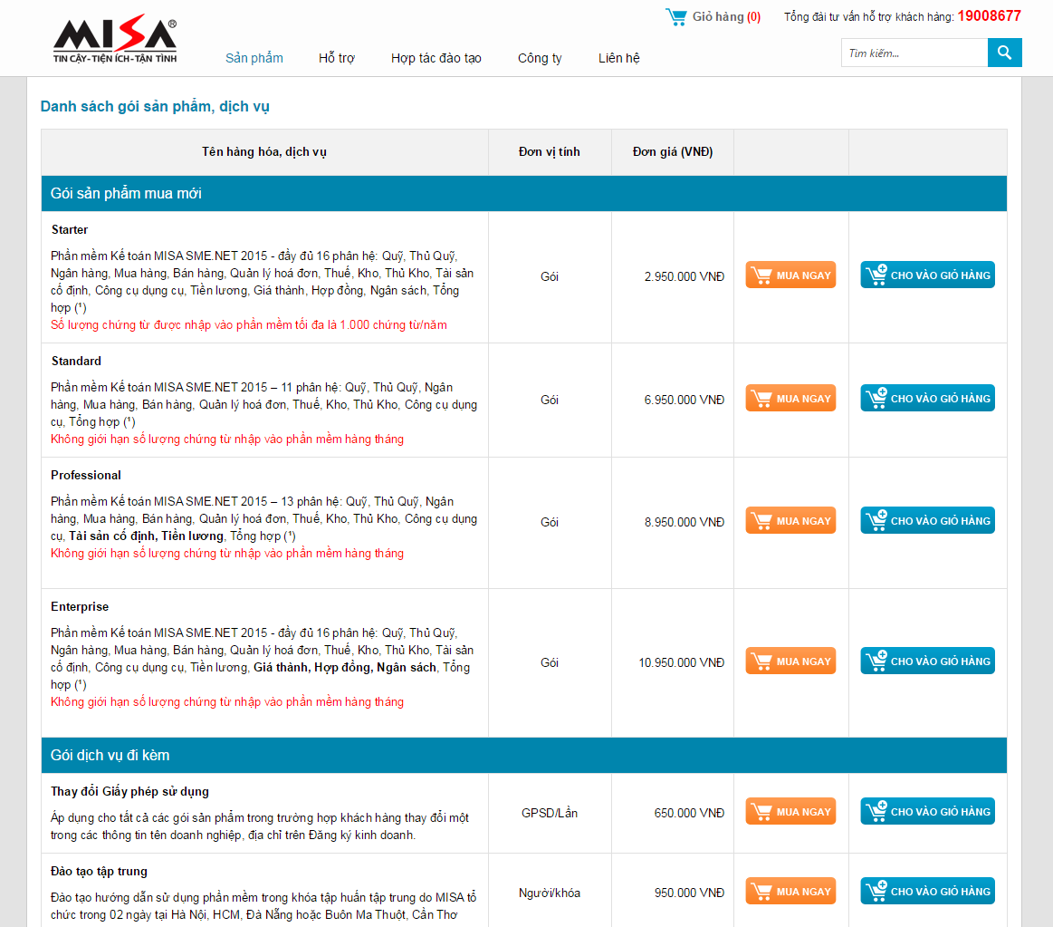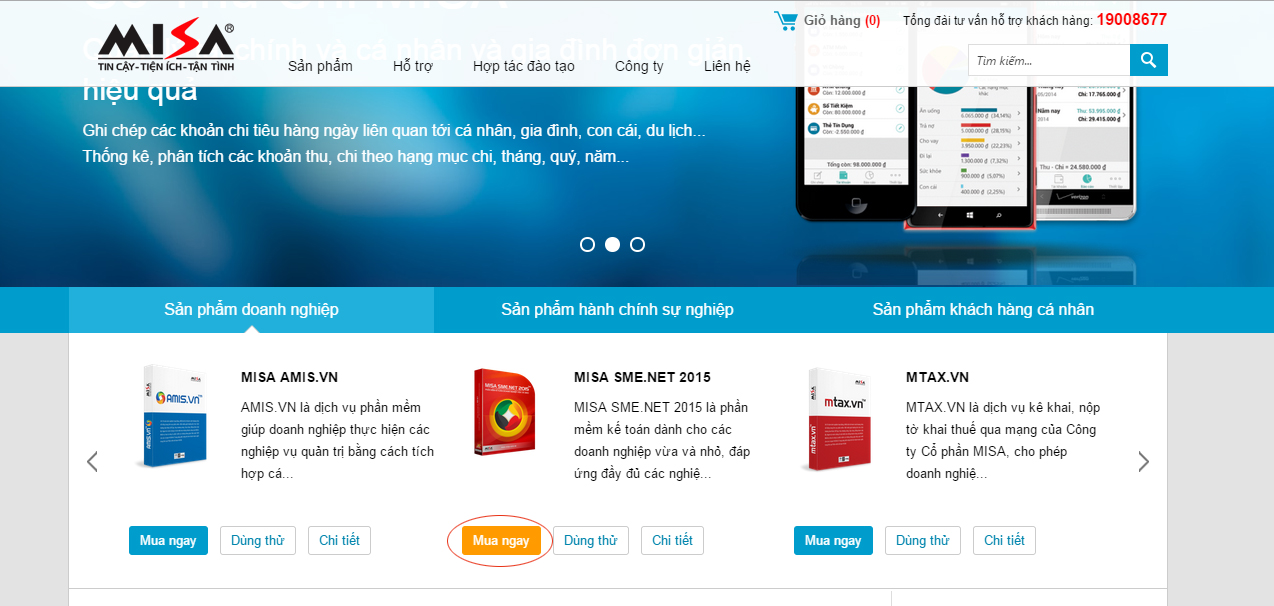 Tại trang chủ của website: http://www.misa.com.vn, Khách hàng có thể bấm vào nút Mua ngay tại mục giới thiệu sản phẩm