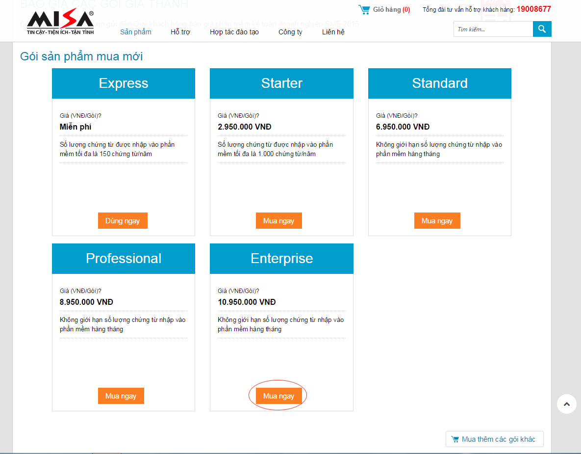 Khi xem giới thiệu chi tiết sản phẩm, Khách hàng có thể kéo thanh cuộn xuống gần cuối trang (mục giới thiệu giá bán các gói SP/DV) và chọn Mua ngay những gói phù hợp với doanh nghiệp của mình: