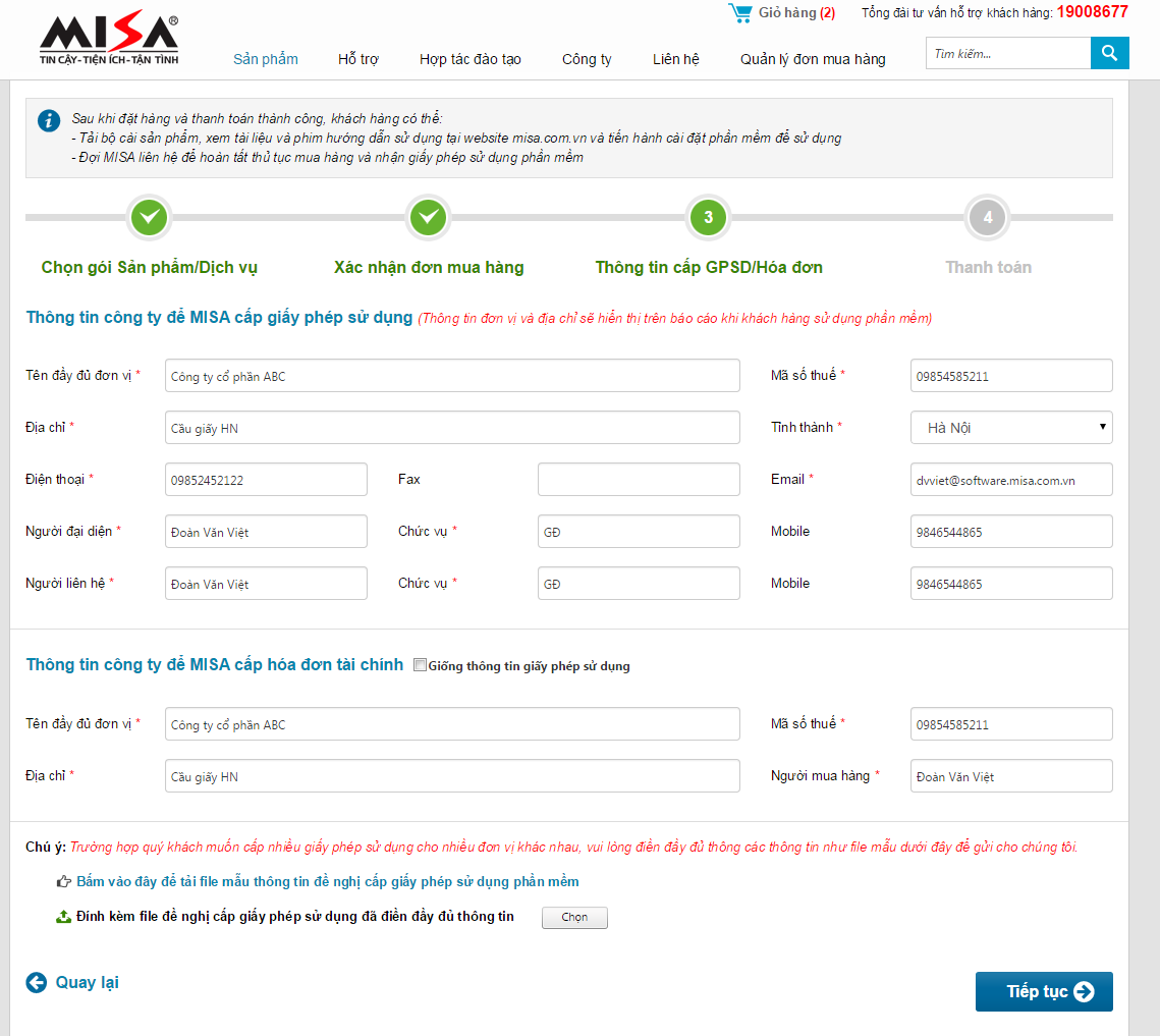 - Trường hợp khách hàng muốn cấp GPSD cho nhiều công ty thì bấm vào link: Bấm vào đây để tải file mẫu thông tin đề nghị cấp giấy phép sử dụng phần mềm để tải file mẫu sau đó điền thông tin và đính kèm vào đơn đặt hàng đang lập để gửi cho MISA cấp GPSD theo những thông tin điền trong danh sách