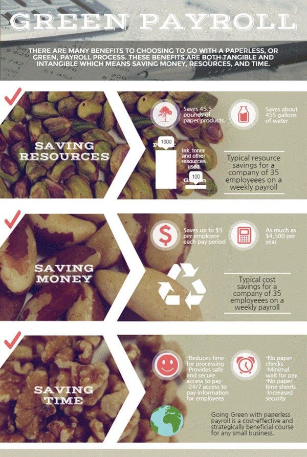 Có một số biện pháp mà bất kỳ doanh nghiệp cũng sẽ thấy được sự tiết kiệm đó là khi chuyển đổi từ một mô hình quy trình tính lương trên giấy sang một mô hình ” Tính Lương Xanh ” hay nói khác hơn là ” Tính Lương không giấy “. Sử dụng công nghệ cao cùng với việc đảm bảo an toàn rủi ro tăng lên đang và sẽ thúc đẩy các phòng nhân sự chuyển sang một “Quy trình không giấy”.