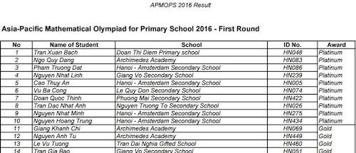 Em Trần Xuân Bách (Tiểu học Đoàn Thị Điểm) được đặc cách thi Olympic Toán châu Á – Thái Bình Dương (APMOPS) vì chưa đủ tuổi, nhưng đã giành điểm cao nhất toàn đoàn Việt Nam và nhận huy chương Bạch kim.