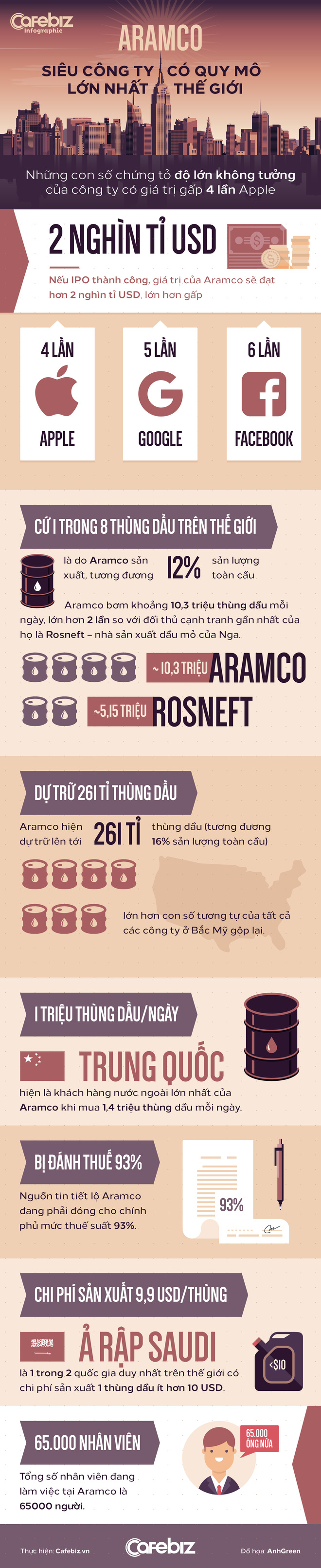 Những số liệu dưới đây chứng tỏ độ lớn không tưởng của Aramco – công ty lớn gấp 4 lần Apple, 5 lần Google và 6 lần Facebook.