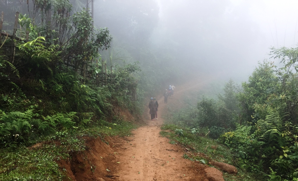 Từ trục đường chính đi vào điểm trường chỉ chừng 2km nhưng chúng tôi phải rất vất vả mới vượt qua được con đường bằng đất nhỏ hẹp, trơn trượt với những con dốc dựng đứng, một bên là vực thẳm.