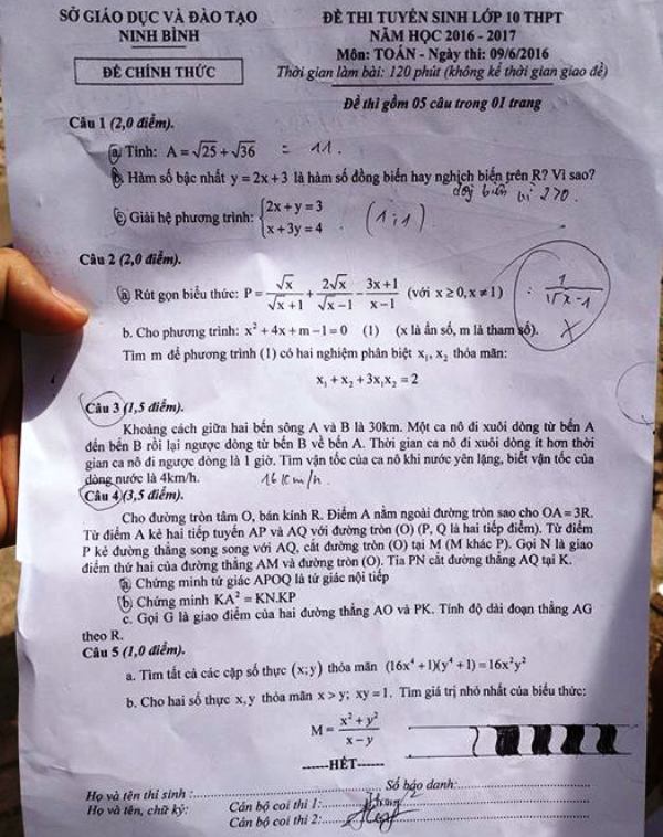 Đề thi môn Toán kỳ thi vào lớp 10 THPT năm học 2016 – 2017 tại Ninh Bình