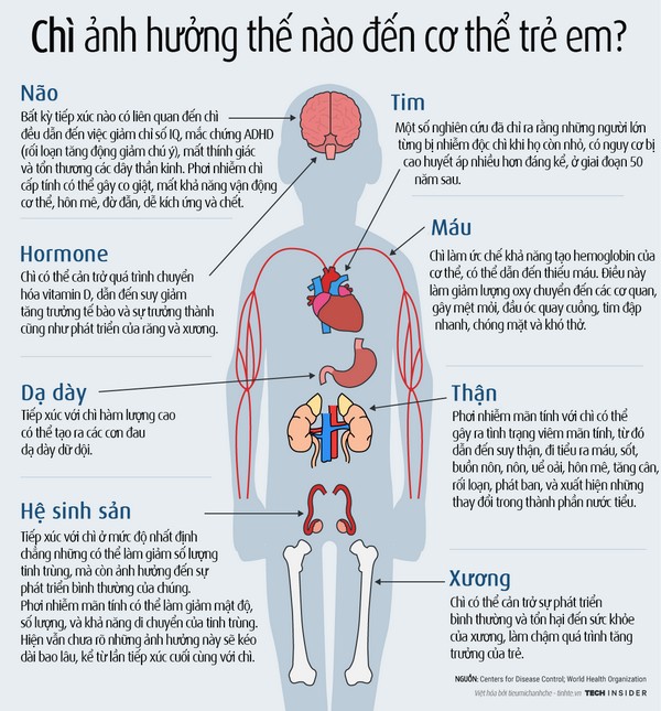Nhiễm độc chì có thể xuất phát từ nhiều nguyên nhân, chẳng hạn như ô nhiễm không khí, nước, đất, thực phẩm, và các sản phẩm tiêu dùng. Để có cái nhìn trực quan về tác hại của chì đối với cơ thể trẻ nhỏ, mời các bạn theo dõi Infographic dưới đây: