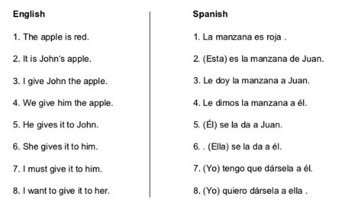 Dưới đây là 8 cấu trúc câu phát triển từ câu “I give John the apple” trong tiếng Anh và Tây Ban Nha.
