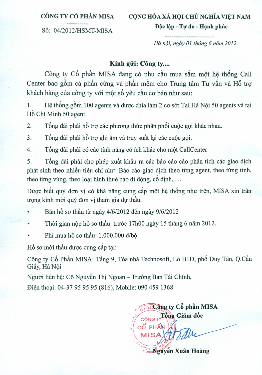 • Địa điểm bán HSMT: Công ty Cổ Phần MISA: Tầng 9, Tòa nhà Technosoft, Lô B1D, phố Duy Tân, Q.Cầu Giấy, Hà Nội
