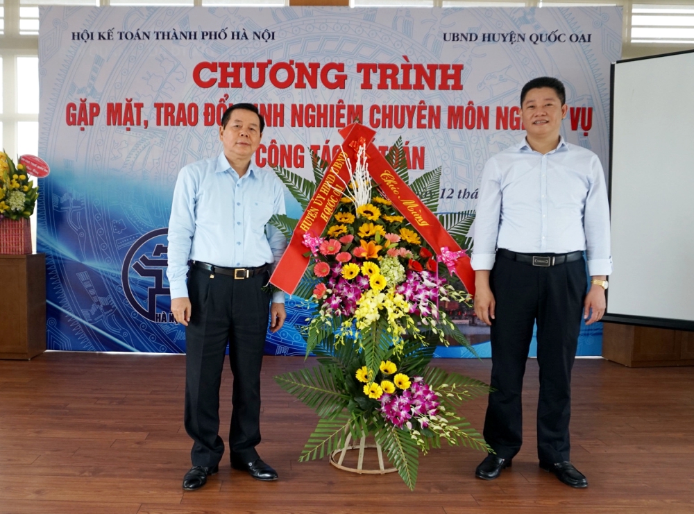 Ông Nguyễn Mạnh Quyền – Thành ủy viên, Bí thư Huyện ủy, Chủ tịch UBND huyện Quốc Oai tặng lẵng hoa tươi tắm và chúc chương trình của Hội Kế toán Tp Hà Nội thành công tốt đẹp