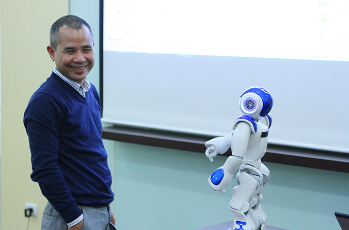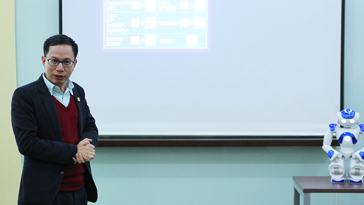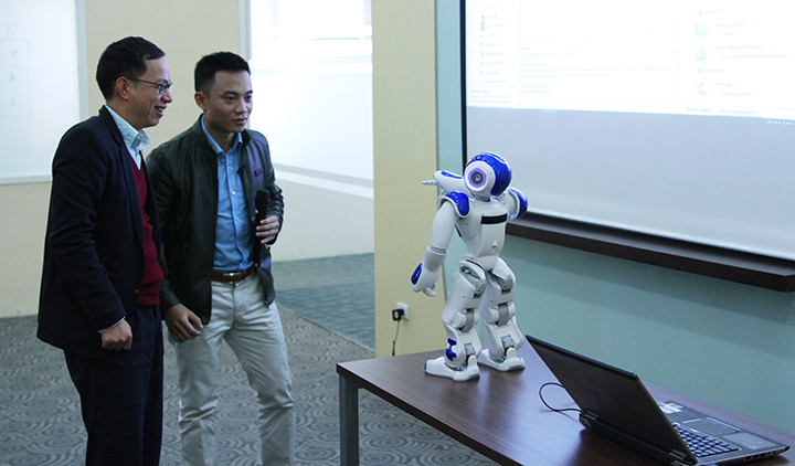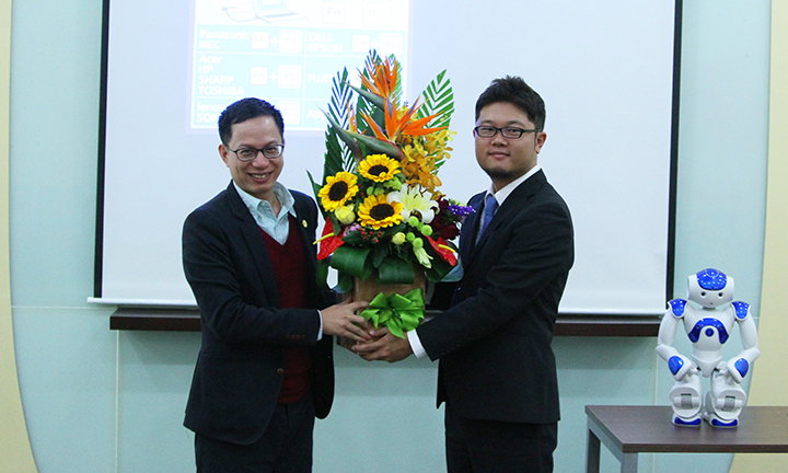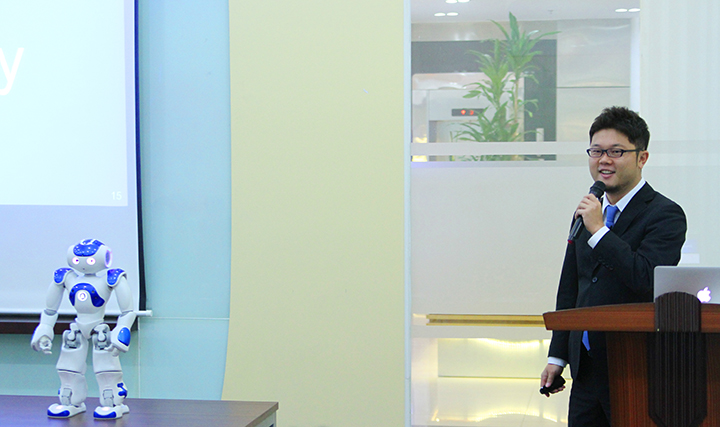 Mr. Takashi Morimoto đã mang tới hội trường nguyên mẫu của Robot NAO và giới thiệu về tính năng, cách thức lập trình, điều khiển cũng như các ứng dụng của Robot trong cuộc sống hàng ngày.