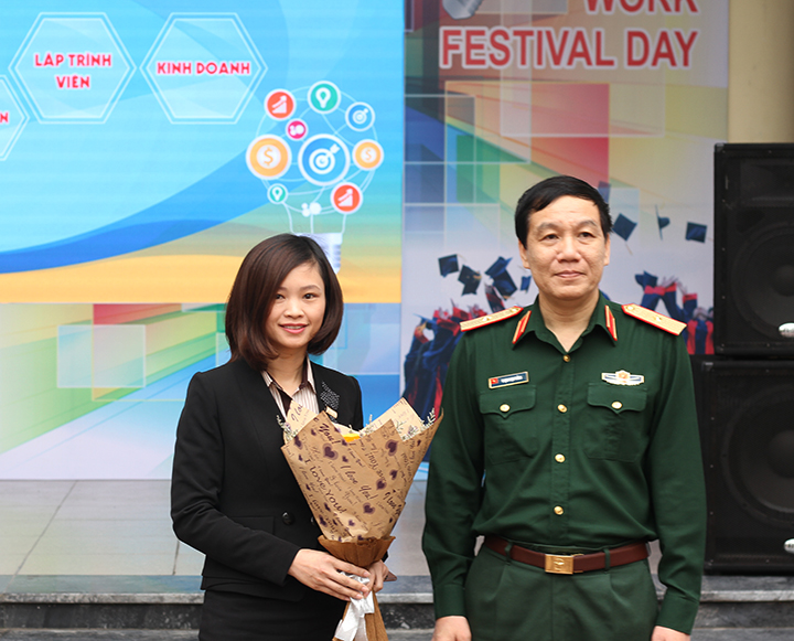 Thiếu tướng Phạm Ngọc Thắng – Phó Chính ủy HV KTQS thay mặt nhà trường tặng hoa cám ơn MISA đã luôn đồng hành cùng nhà trường trong các hoạt động đào tạo, tuyển dụng