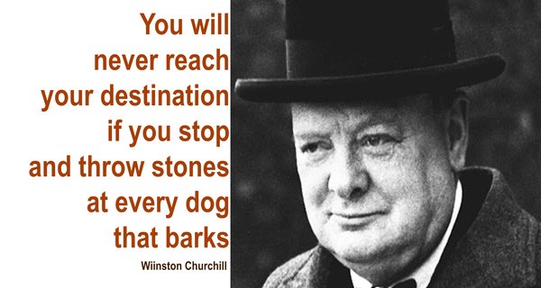 Winston Churchill cũng có một câu nói nổi tiếng: “Bạn sẽ không bao giờ đạt đến đích, nếu bạn cứ dừng lại và ném đá vào mỗi con chó bên đường, chỉ vì tiếng sủa của chúng”.
