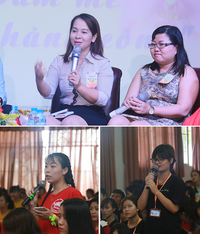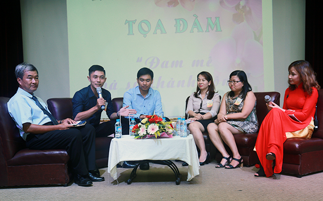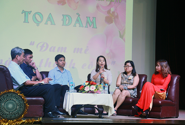 Bà Nguyễn Ngọc Lệ (thứ 3 từ phải sang) tham gia tọa đàm với sinh viên trường