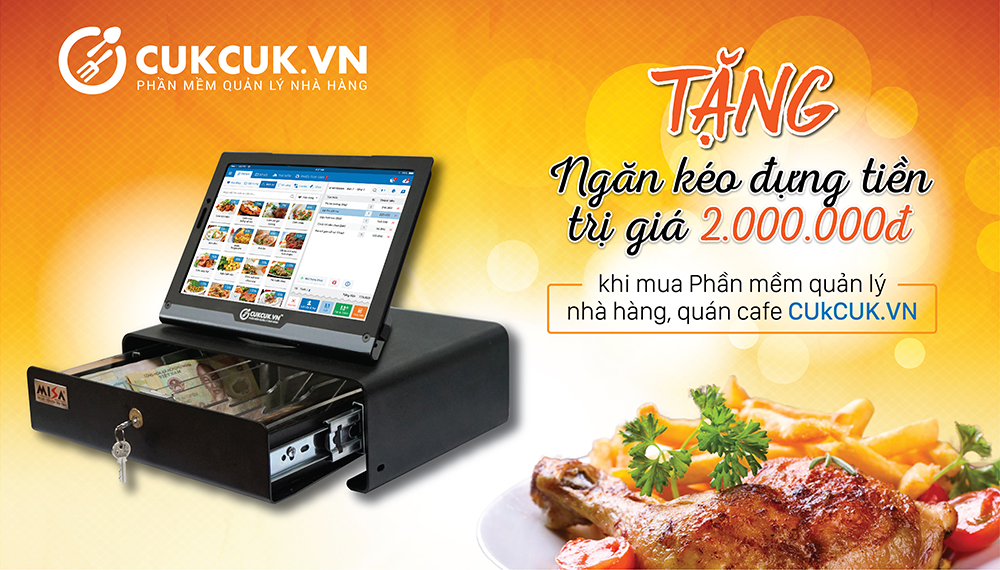 Từ ngày 19/6/2017 – 30/6/2017, khi mua phần mềm quản lý nhà hàng, quán cafe CUKCUK.VN, khách hàng sẽ được tặng ngay 01 ngăn kéo đựng tiền và 01 giá đỡ máy tính bảng (không bao gồm máy tính bảng) trị giá 2.000.000 VNĐ khi mua phần mềm quản lý nhà hàng, quán cafe CUKCUK.VN.