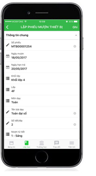 Giáo viên có thể lập phiếu mượn trả thiết bị trực tiếp trên Mobile