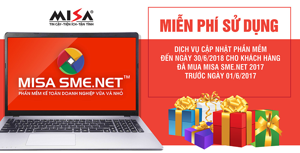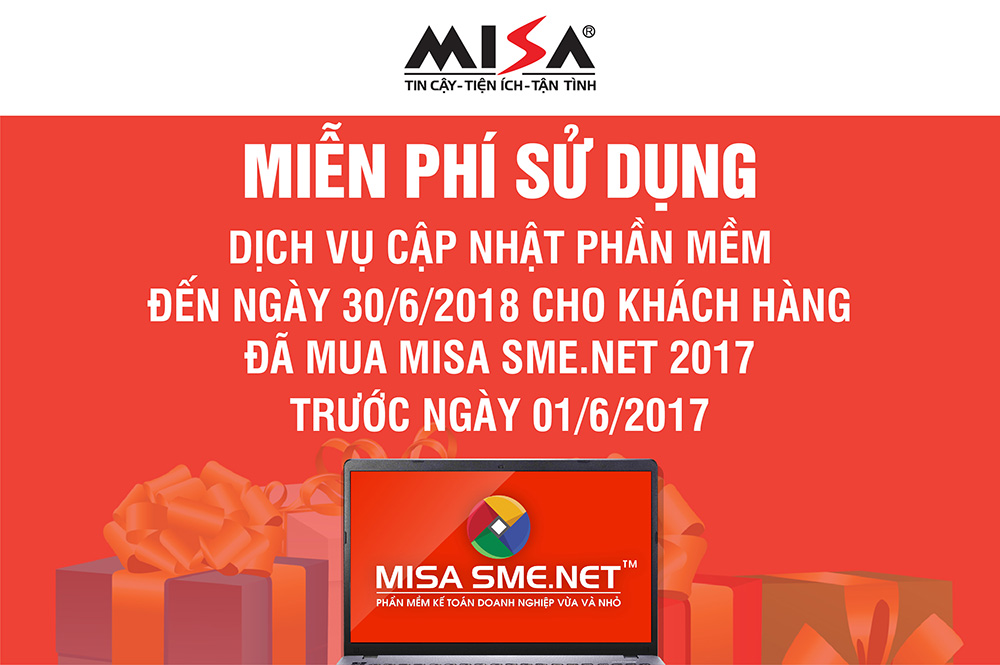 Đặc biệt, MISA dành tặng Quý khách hàng đang sử dụng phần mềm MISA SME.NET 2017 các ưu đãi như sau: Khách hàng đã mua mới hoặc nâng cấp lên phần mềm MISA SME.NET 2017 trước ngày 01/06/2017 sẽ được tặng thêm thời gian sử dụng gói dịch vụ cập nhật hàng năm đến ngày 30/06/2018.