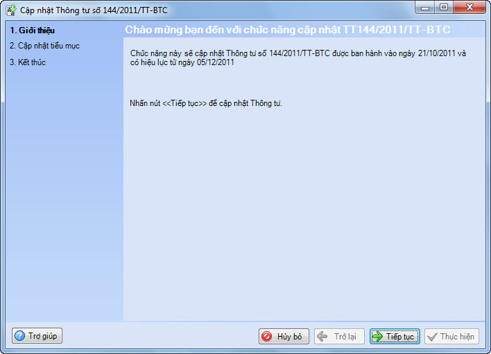 Tệp\Cập nhật thông tư\Cập nhật Thông tư số 144/2011/TT-BTC, phần mềm xuất hiện hộp thoại: