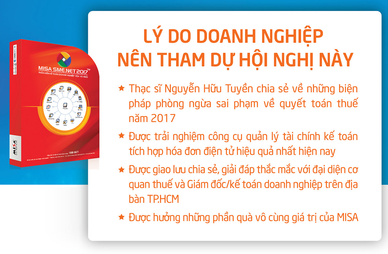 Đối với mỗi kì quyết toán, doanh nghiệp luôn đối mặt với áp lực từ phía cơ quan thuế khi phải giải trình cũng như chuẩn bị đầy đủ chứng từ đối với mỗi nghiệp vụ phát sinh tại công ty. Hiểu được điều đó MISA sẽ giúp cho khách hàng nắm rõ các hồ sơ để phục vụ công tác quyết toán Thuế năm 2017. Đồng thời năm 2018 sẽ là năm ứng dụng rộng rãi hóa đơn điện tử để tiết kiệm 80% chi phí hóa đơn. Công ty Cổ phần MISA tổ chức buổi hội thảo: