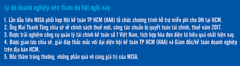 Chỉ còn 1 tháng nữa là đến hạn nộp báo cáo quyết toán năm 2017 và nhằm hỗ trợ cho các DN trên địa bàn Tp.HCM cập nhật các chính sách Thuế mới và các lưu ý quan trọng khi lập báo cáo tài chính năm 2017, MISA phối hợp cùng Hội Kế Toán Tp.HCM tổ chức chương trình hội thảo với nội dung: