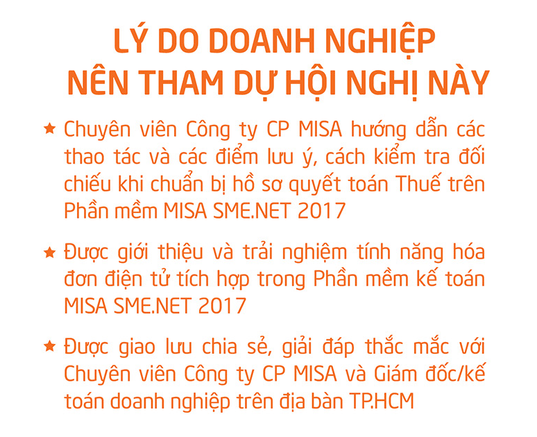 “HƯỚNG DẪN NHƯNG ĐIỂM LƯU Ý KHI QUYẾT TOÁN THUẾ 2017 VÀ GIỚI THIỆU TÍCH HỢP HÓA ĐƠN ĐIỆN TỬ TRÊN PHẦN MỀM KẾ TOÁN MISA SME.NET 2017”
