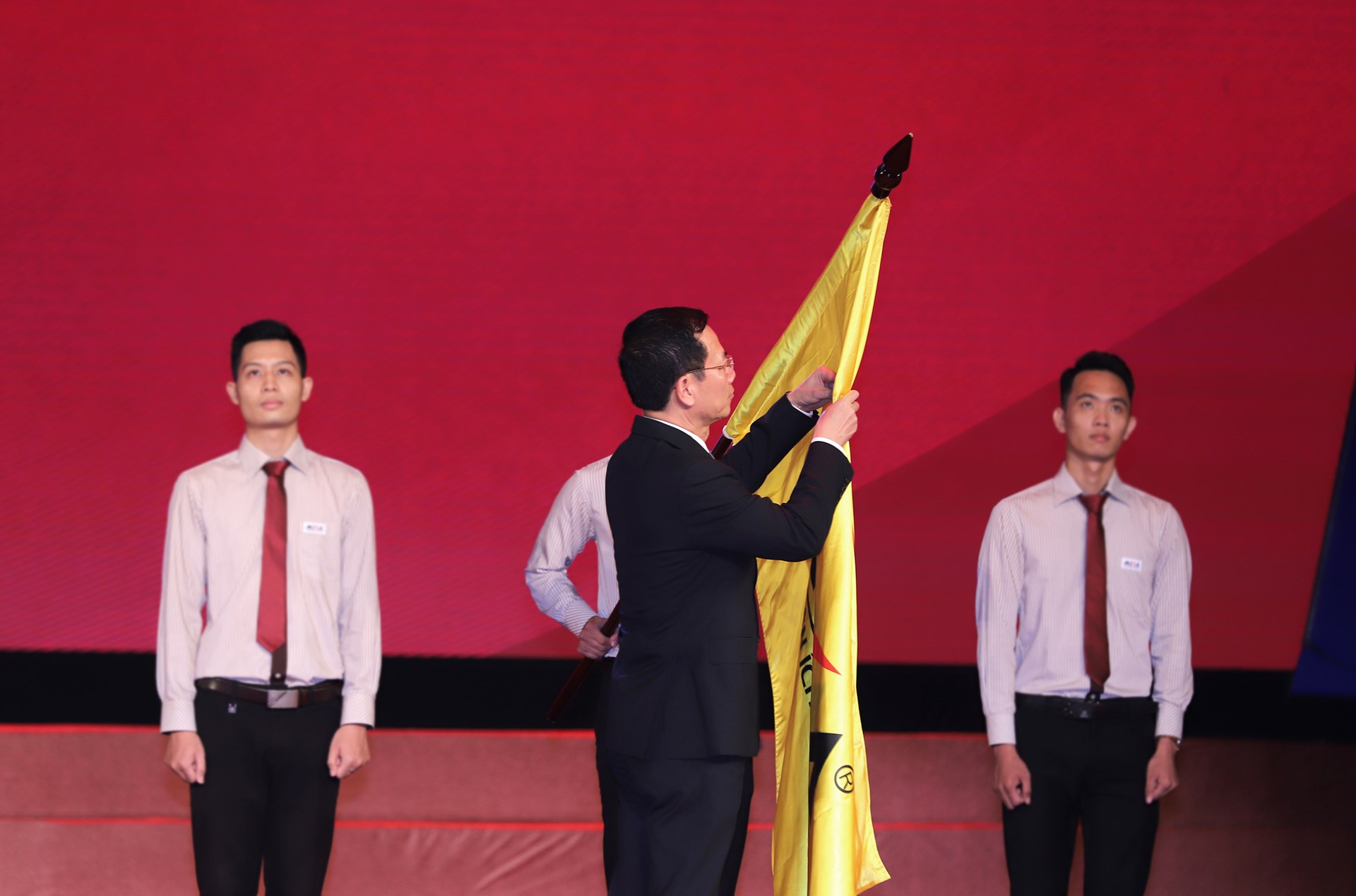 Bộ trưởng Bộ Thông tin và Truyền thông Nguyễn Mạnh Hùng thay mặt lãnh đạo Đảng và Nhà nước trao tặng Huân chương Lao động hạng Nhì cao quý lên cờ truyền thống của MISA