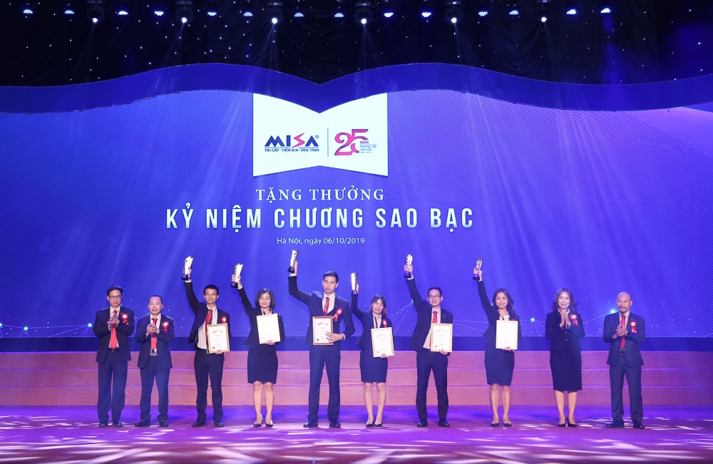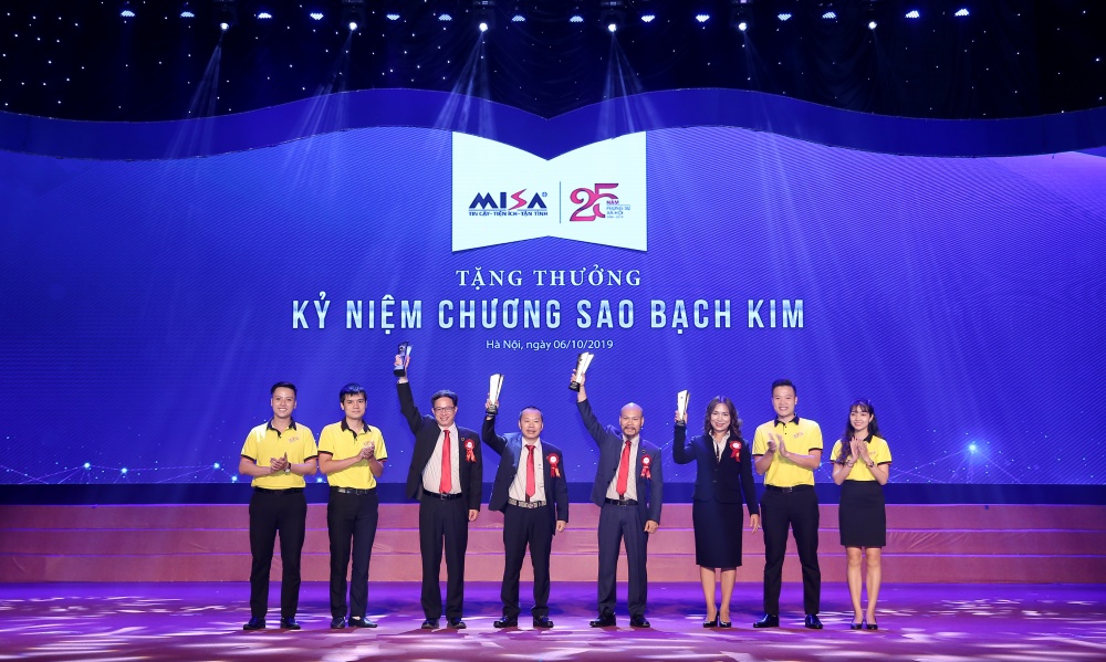 Đại diện các thế hệ trẻ MISA được lên trao kỷ niệm chương Sao Bạch kim cho: Ông Lữ Thành Long (Chủ tịch HĐQT, thứ năm từ trái sang), ông Lữ Hồng Chương (Phó Chủ tịch HĐQT, thứ tư từ trái sang), ông Nguyễn Xuân Hoàng (Phó Chủ tịch HĐQT, thứ ba từ trái sang) và bà Đinh Thị Thúy (Tổng Giám đốc, thứ sáu từ trái sang – những người đã gây dựng và chèo lái con thuyền MISA suốt 25 năm qua.