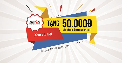 Từ nay đến hết 31/12/2019, khi mua mới hoặc gia hạn các sản phẩm MISA SME.NET, AMIS.VN, MeInvoice.vn, Startbooks.vn, Mshopkeeper.vn, CUKCUK.VN, Quý Khách hàng sẽ được tặng ngay 50.000đ vào tài khoản tổng đài MISA SUPPORT dùng để liên hệ với nhân viên tư vấn (Theo số điện thoại Quý Khách hàng đã đặt hàng, thanh toán với MISA ).