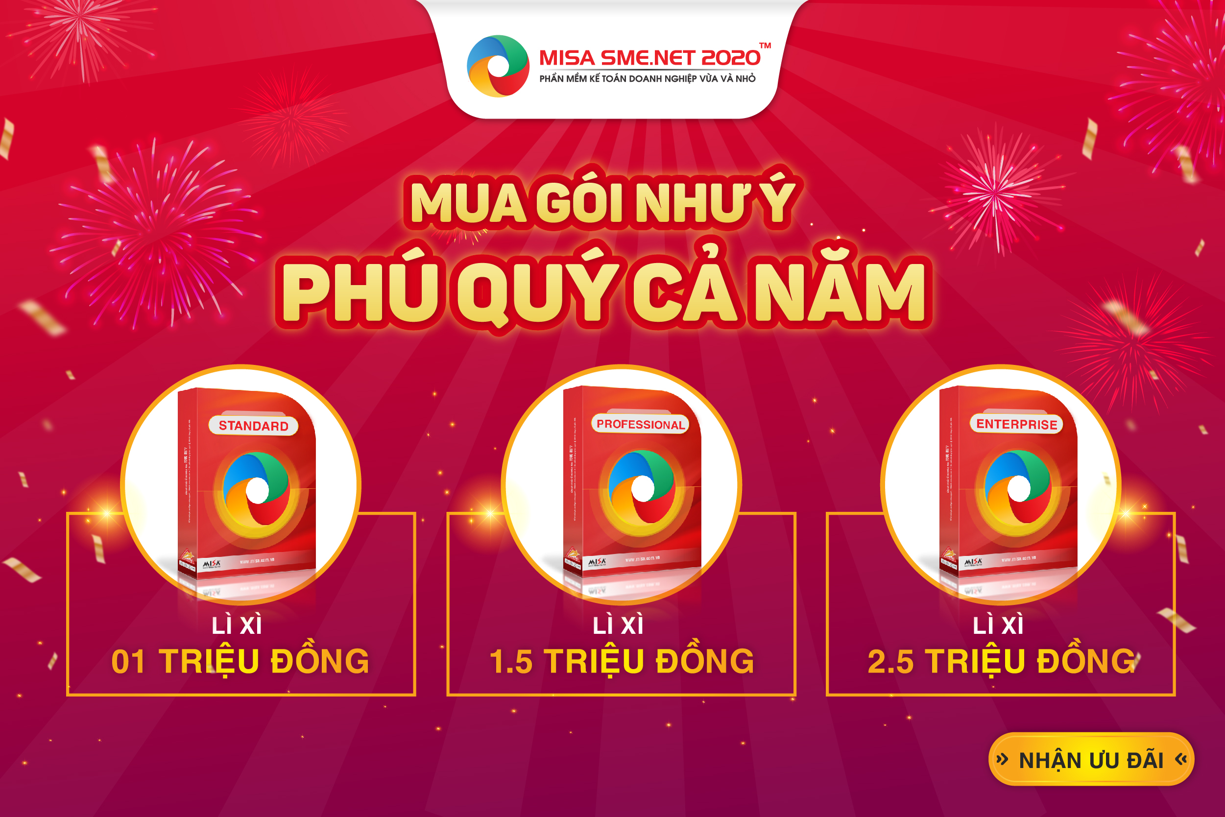 Khởi đầu năm tài chính mới với nhiều tài lộc, MISA kính chúc Quý khách hàng nhiều sức khỏe và vạn sự như ý trong năm mới. Nhằm hỗ trợ tối đã cho Quý khách hàng, ngay đầu tháng 2 năm 2020, MISA ra mắt chương trình khuyến mãi: “Tặng 1000 lì xì lần lượt 1 – 1,5, 2,5 triệu cho doanh nghiệp khi triển khai Phần mềm kế toán MISA SME.NET 2020”
