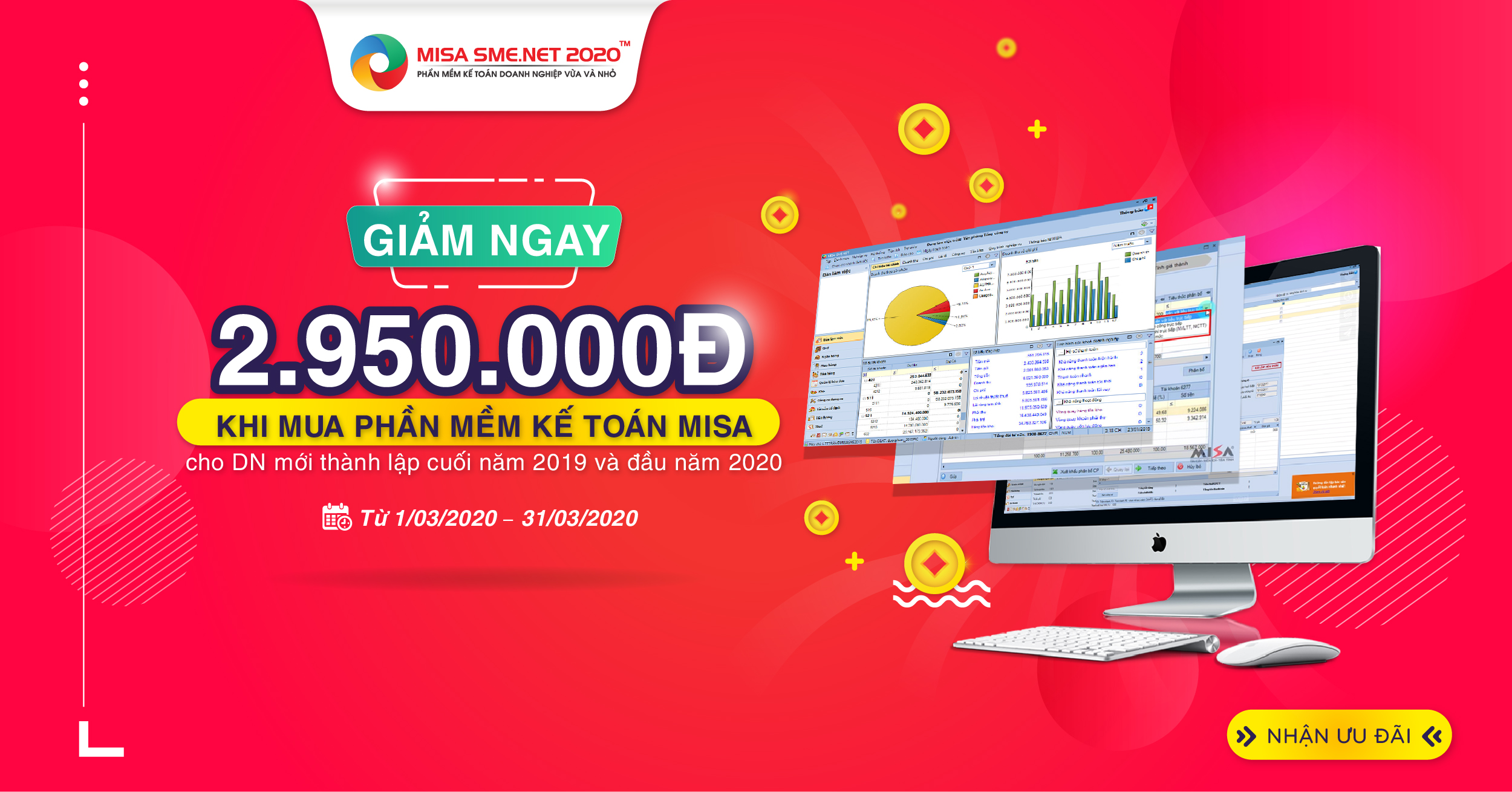 Tháng 3 là “giai đoạn nước rút” các doanh nghiệp mới thành lập hoàn thành báo cáo tài chính, thực hiện các loại báo cáo theo quy định của nhà nước. Nhằm hỗ trợ cho chủ doanh nghiệp và kế toán hoàn thành đầy đủ và chính xác những yêu cầu do cơ quan nhà nước đề ra và quản lý tốt tình hình tài chính trong công ty, MISA đồng hành cùng doanh nghiệp mới thành lập thông qua chương trình: “ƯU ĐÃI TỚI 2.950.000Đ khi mua mới PHẦN MỀM KẾ TOÁN MISA cho doanh nghiệp thành lập 6 tháng cuối năm 2019 và trong năm 2020”