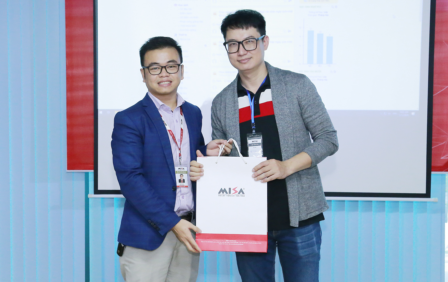 Ông Bùi Thanh Minh (bên trái) – Giám đốc Khối dự án Nền tảng tài chính doanh nghiệp –  đại diện MISAtặng quà lưu niệm với ông Nguyễn Quang Vinh