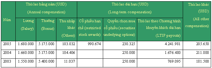 Cơ cấu thù lao của ông Palmisano, Chủ tịch kiêm Giám đốc điều hành của tập đoàn IBM, trong 3 năm 2003-2005 được tóm tắt trong bảng sau:
