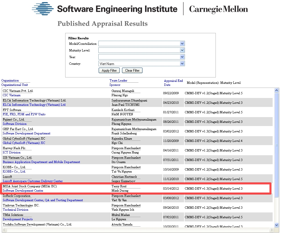 Tên của MISA đã xuất hiện trong danh sách các công ty đạt chứng nhận CMMI trên website của SEI