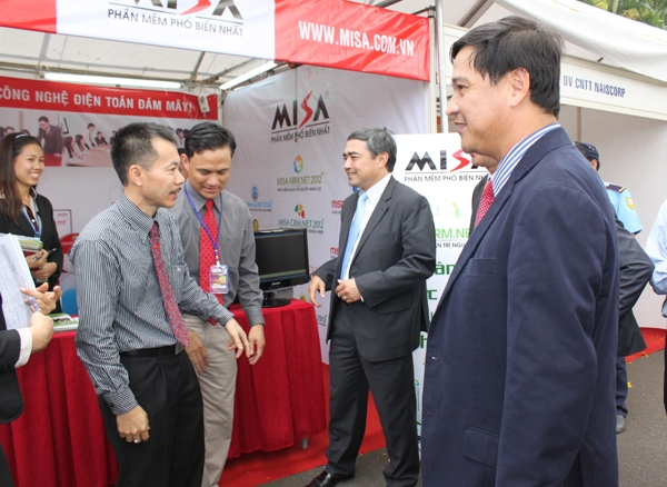 Các đại biểu đến thăm gian hàng của MISA: ông Nguyễn Minh Hồng – Thứ trưởng bộ TT & TT (thứ 4 từ trái qua), ông Lê Bá Trình – Phó Chủ tịch UB MTTQ VN (Thứ 5 từ trái qua), ông Nguyễn Trọng Đường – Vụ trưởng Vụ CNTT (ngoài cùng bên phải), ông Chu Tiến Dũng – Chủ tịch Hội đồng thành viên CV PM QT (thứ 2 từ trái qua)