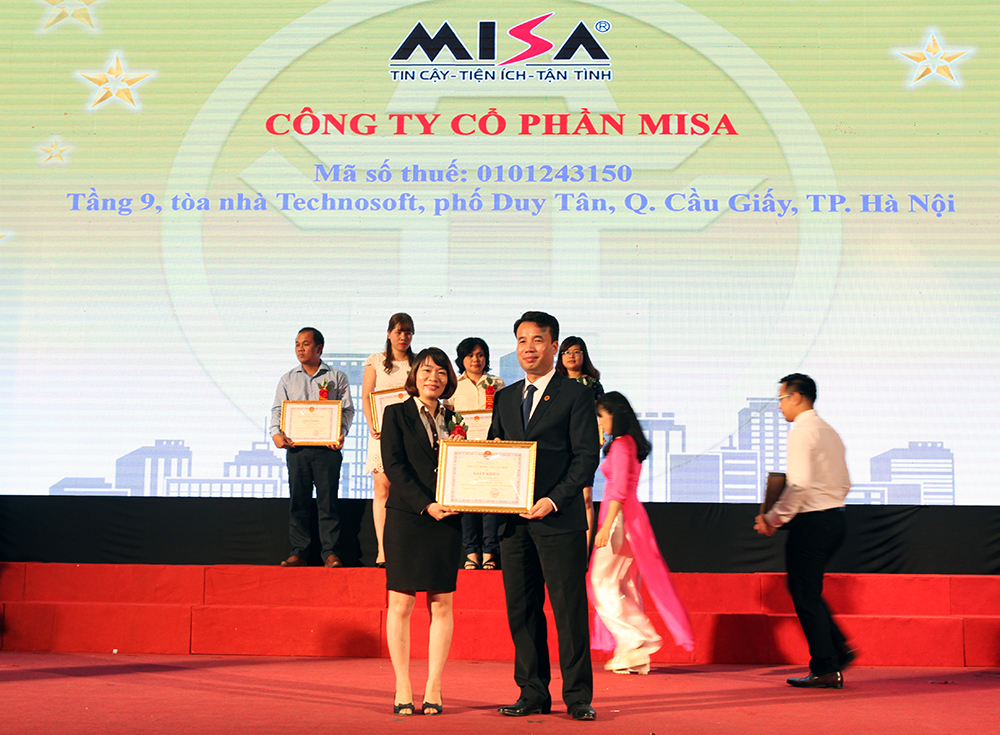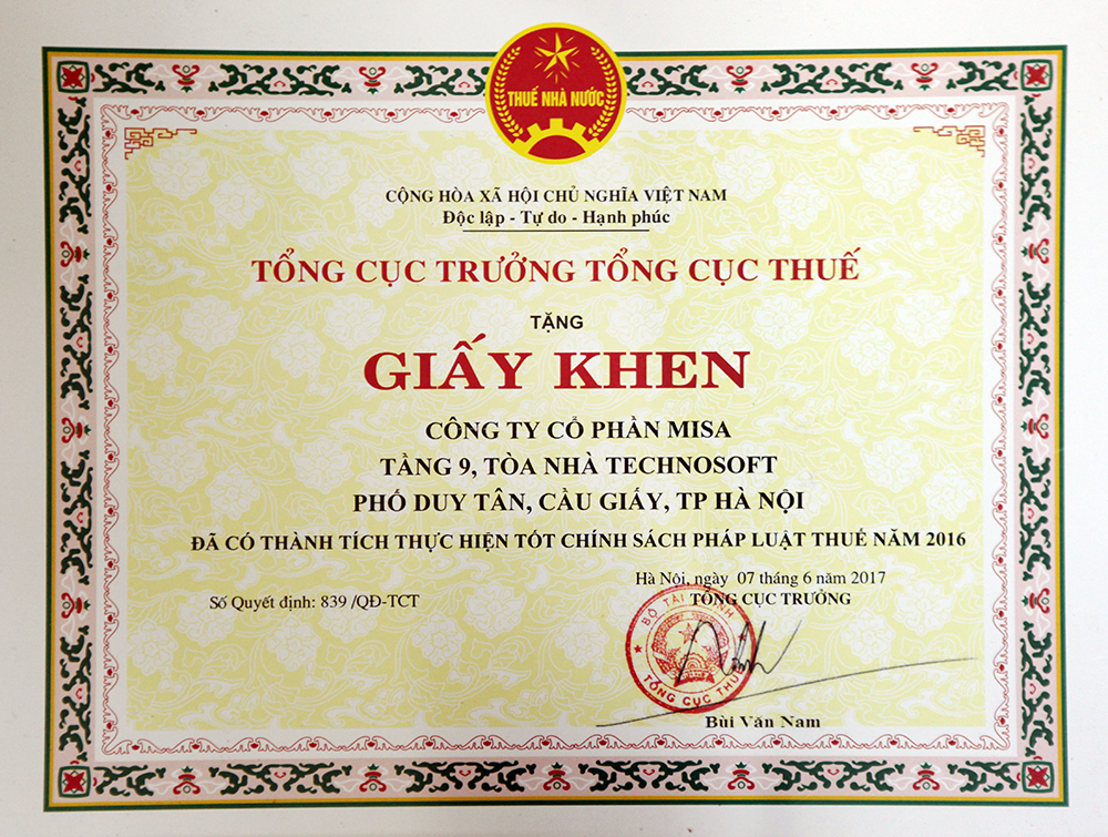 Ngày 03/08/2017, tại Hội nghị tuyên dương, khen thưởng người nộp Thuế do Cục Thuế TP Hà Nội tổ chức. MISA vinh dự nhận giấy khen từ Tổng cục Thuế vì đã có thành tích thực hiện tốt chính sách pháp luật Thuế năm 2016.