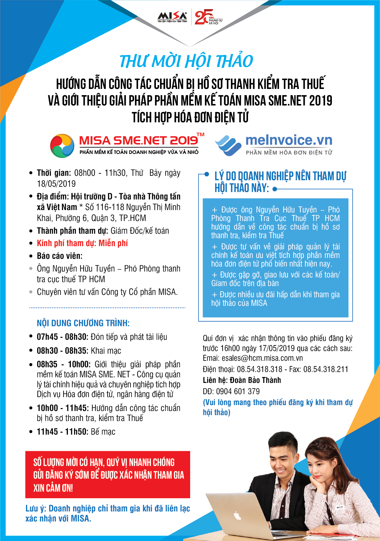 Hội thảo tại TP HCM ngày 18/05: Hướng dẫn thanh kiểm tra thuế và tư vấn giới thiệu phần mềm kế toán MISA có tích hợp giải pháp hóa đơn điện tử